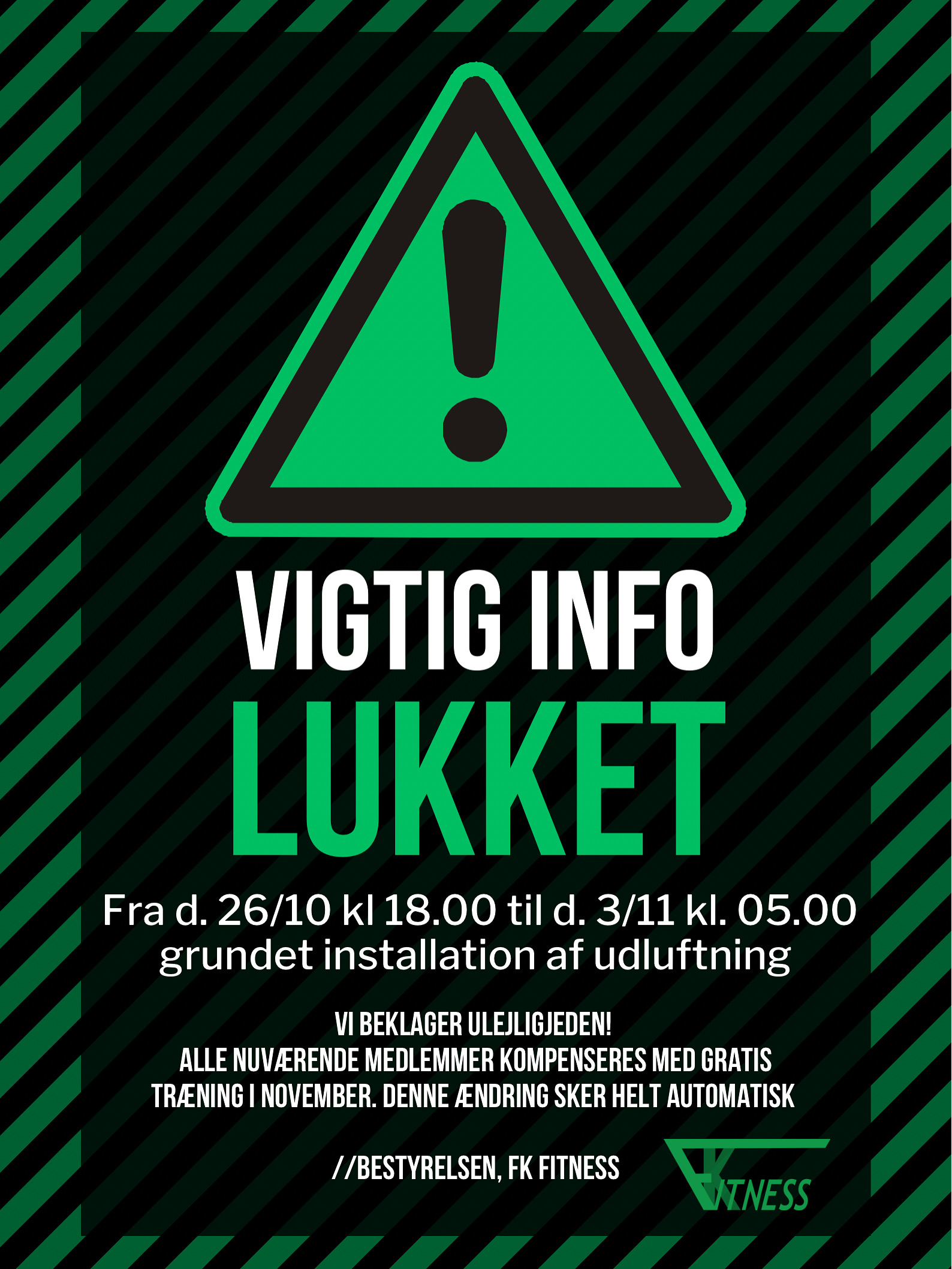 ❗️OBS❗️Vi er netop blevet informeret om, at det i næste uge er nødvendigt at lukke centeret helt under installationen af det længe ventede udluftningssystem i centeret, hvilket ikke var antaget i første omgang. Vi beklager meget ulejligheden og den sene information. Til gengæld træner alle nuværende medlemmer gratis i november. Vi glæder os til at se jer tilbage i centeret i uge 45 – med forbedret indeklima 🥳